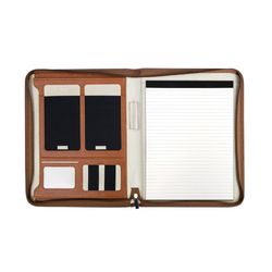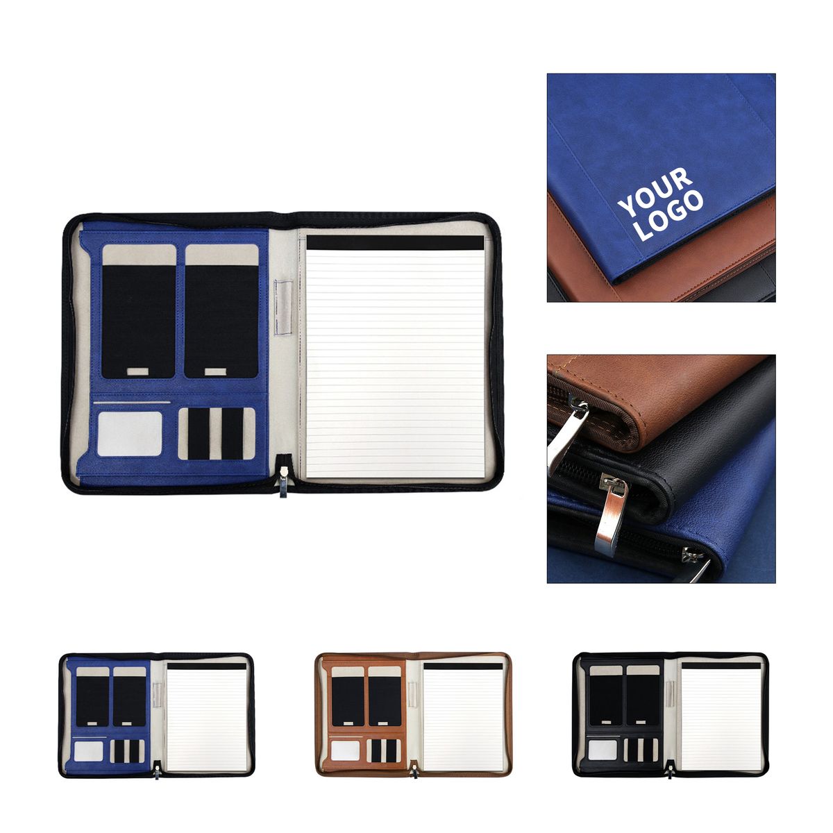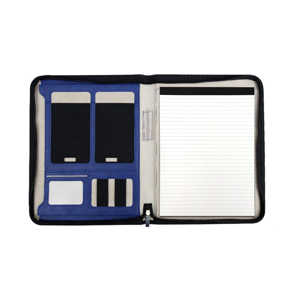 This A4 zipper padfolio uses a smooth polyurethane cover that presents a clean look while protecting documents in meetings or travel. Inside, multiple slots organize a phone, cards, cables, and accessories, and a clipboard panel accommodates A4 or Letter paper. A compact notebook section with sticky notes supports quick marking during reviews. The slim build slides into a briefcase, making it suitable for interviews or conferences. Measuring 12.6" long by 10.2" wide, it provides structured storage with a front decoration area for identity marks.